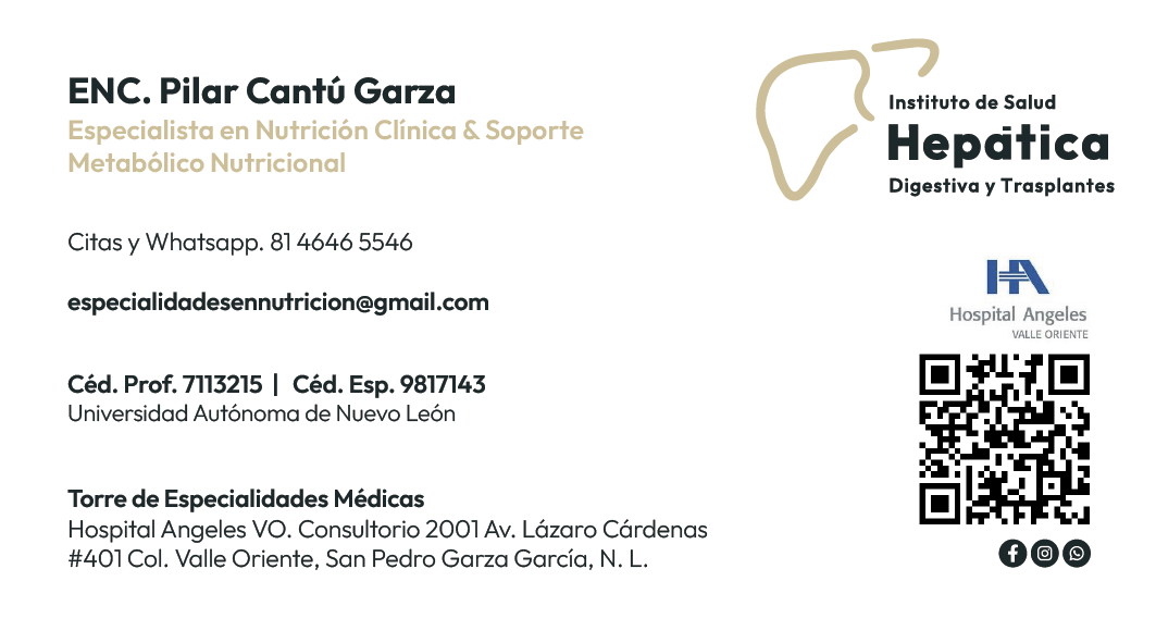 Reserva tu ConsultaLa ENC. Pilar Cantú es Especialista en Nutrición Clínica por la Universidad Autónoma de Nuevo León, Máster en Soporte Metabólico Nutricional por la Escuela de Dietética y Nutrición A.C., Certificada en el Manejo Nutricional de pacientes con enfermedades Hepáticas, Digestivas, Renales, Metabolicas, Oncológicas, Perioperatorios por la ESPEN, FELANPE y FNNC, Miembro Activo de la Asociación Iberoamericana de Nutrición Oncológica y Nutrición Clínica, Miembro Activo del Colegio Mexicano de Nutrición Clínica y Terapia Nutricional A.C.